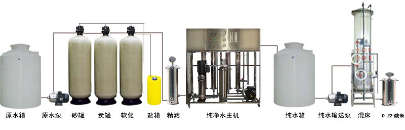 3、采用混合離子交換方式,其流程如下:源水→源水增壓泵→多介質(zhì)過濾器→活性炭過濾器→軟水器→精密過濾器→一級(jí)反滲透→陰陽(yáng)樹脂混床→微孔過濾器→用水點(diǎn)