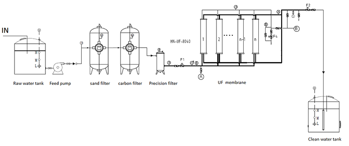 原水箱-原水泵-錳砂過濾器-活性炭過濾器-微濾過濾器-中空超濾膜裝置(主機(jī))-無菌儲(chǔ)水罐-臭氧混合機(jī)-洗罐裝設(shè)備-燈檢