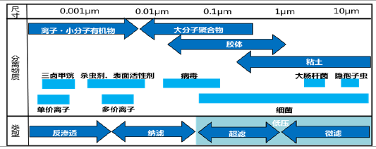 新國標(biāo)的出臺(tái)必將推動(dòng)我國飲用水水質(zhì)的提高,并進(jìn)一步促進(jìn)我國供水行業(yè)凈水工藝的改進(jìn)。市政自來水廠的傳統(tǒng)工藝包括藥劑混合-沉淀-濾料過濾-殺菌,這些工藝可以去除懸浮雜質(zhì)、部分大分子有機(jī)物、細(xì)菌、病毒等物質(zhì),但對于一些更細(xì)小的無機(jī)、有機(jī)物質(zhì)就需要在市政領(lǐng)域增加新型工藝——膜法處理。目前膜法處理主要包括微濾、超濾、納濾及反滲透。如何選擇適當(dāng)?shù)奶幚砉に,我們首先需要了解下各種膜的主要特點(diǎn)。
